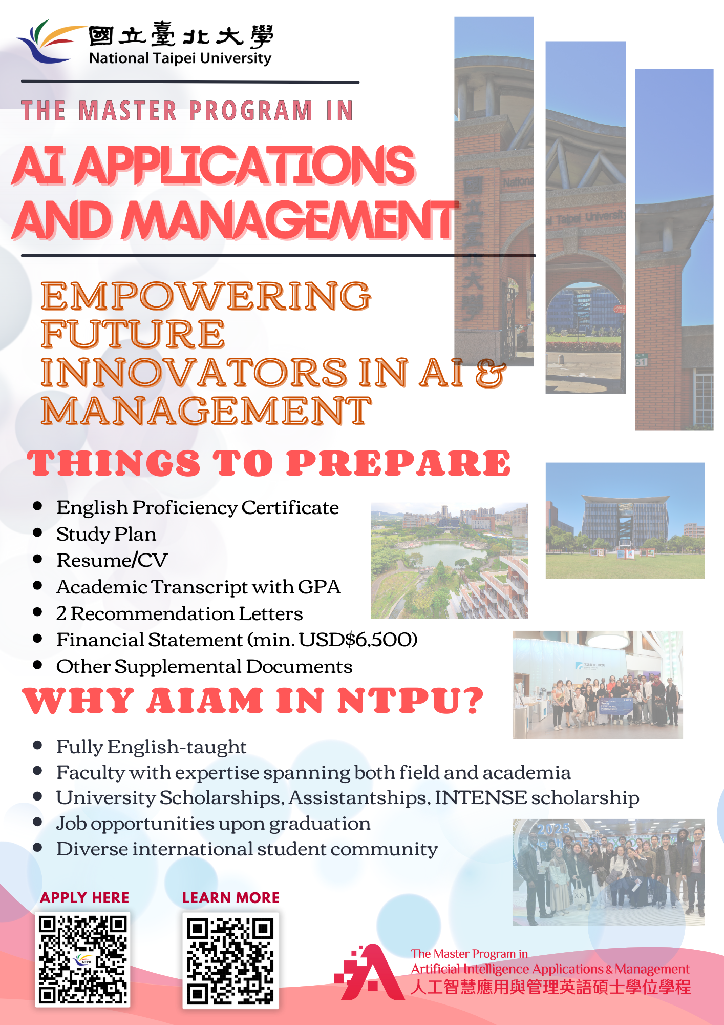 Apply to the AIAM Master’s Program at National Taipei University and gain the AI skills, management insight, and international perspective needed to lead digital innovation and sustainable growth.